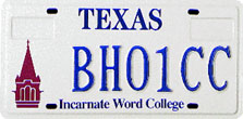 Incarnate Word C. (San Antonio) First Issued: 1994 Available as: Personalized, disabled, personalized disabled. NOTE: This school is now called University of the Incarnate Word. It is not known if the plate design has changed. |