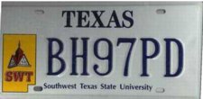 Southwest Texas State U. (1994-2003) In 2003, name changed to Texas State U. Available as: Personalized, disabled, personalized