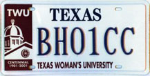 Texas Woman's University (Denton)- WEBSITE First Issued: 2001 Available as: Personalized, disabled, personalized disabled. |